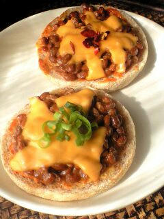 2つに割ったマフィンにマヨネーズとおやじ味噌(←ブレンド辛味噌の商品名)を塗り、片方には納豆に付属のタレを混ぜたもの、もう片方には納豆にコチュジャンを混ぜたものを乗せてチーズも乗せて、トースターでこんがり焼くと完成。