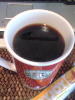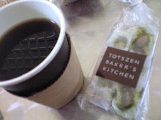 のカフェで買ったコーヒーで、コントライヴ見る前にランチ。